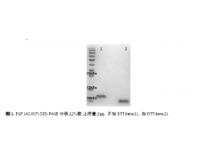 图1. EGF (AZ-007) SDS-PAGE分析,12%胶,上样量:2μg, 不加DTT(lane 1), 加DTT(lane 2).