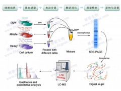 SILAC即细胞培养条件下稳定同位素标记技术(Stable isotope labeling with amino acids in cell culture,SILAC),其基本原理是在细胞培养时,采用含有轻、中、重同位素型必需氨基酸的培养基进行细胞培养,用于SILAC主要的稳定同位素氨基酸是Lys和Arg,细胞在传代培养过程中同位素氨基酸将被细胞用于合成蛋白质,细胞经传代培养5-6代后,细胞的所有蛋白质将被同位素标记,等量混合标记的蛋白质后经过SDS-PAGE分离和质谱分析,通过比较一级质谱图中三个同位素型肽段的面积大小进行相对定量,同时二级谱图对肽段进行序列测定从而鉴定蛋白质。