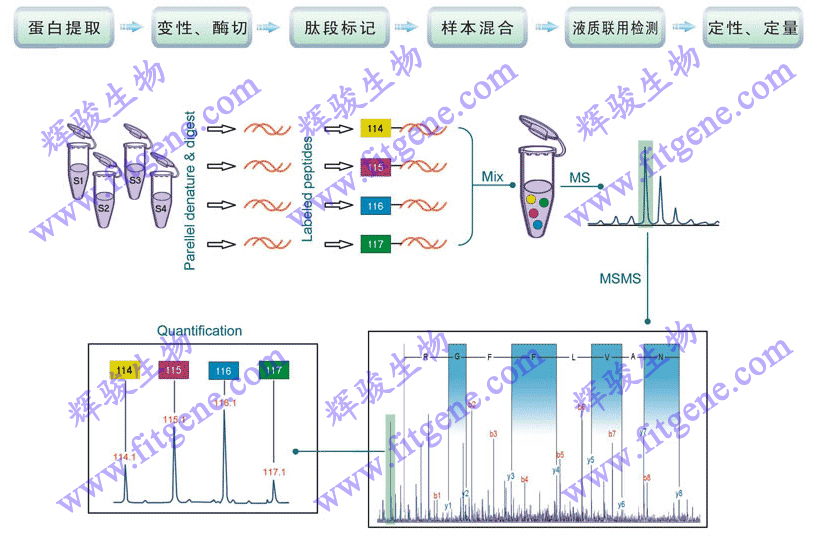 iTRAQ (Isobaric tag for relative and absolute quantitation,iTRAQ)定量分析蛋白质的基本原理是利用iTRAQ试剂是可与氨基酸末端氨基及赖氨酸侧链氨基连接而标记上肽段,经过色谱分离,一级质谱和二级质谱分析,在质谱图中,被标记的不同样本中的同一肽段表现为相同的质荷比。在串联质谱中,信号离子表现为不同质荷比(114~121)的峰,因此根据波峰的高度及面积,可以鉴定出蛋白质和分析出同一蛋白质不同处理的定量信息。
