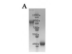 人源VEGF-Fc是将VEGF121基因3’端与人IgG1的Fc基因融合,由哺乳动物细胞表达。重组VEGF121-Fc含有359个氨基酸,通过分子间二硫键形成同源二聚提,单体理论分子量为41kDa,该蛋白通过亲和层析纯化,SDS-PAGE检测其纯度>95%(图1),ELISA检测其EC50值为5ng(图2)。