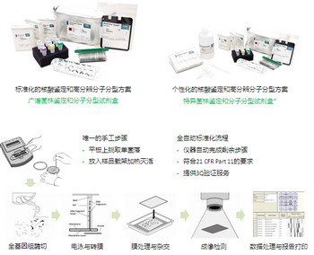 RiboPrinter® System 全自动微生物基因指纹鉴定系统以微生物独特的基因组为基础,可自动化同步完成菌株水平的鉴定和分子分型,实现产品、环境、设备、人员等全方位的微生物风险预警和污染溯源。该系统拥有10多项专利技术,基本原理为限制性内切酶长度多态性分析(RFLP)和分子印迹杂交(Southern Blot)分析,可进行但不局限于核糖体分型(Ribotyping)及其拓展应用,更可开展个性化的酶切、电泳和探针杂交研究,满足多种用途的应用需求。